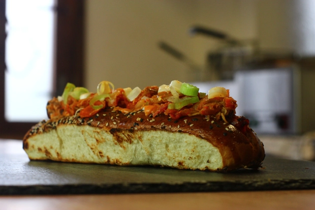 Trhané vepřové, cheddar, naše kimchi, okurky v sezamovým oleji, hoisin mayo